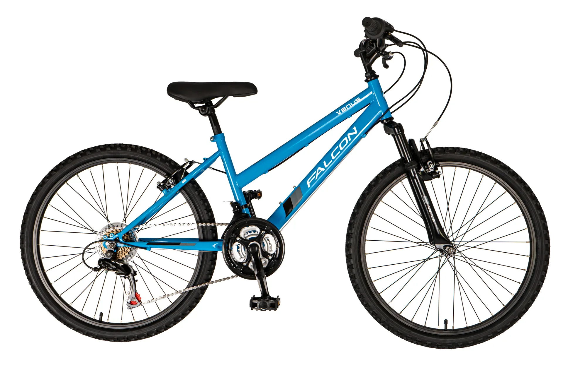 The falcon venus 24" bike has been designed specifically for junior riders aged 9-12 years with a lightweight frame and performance suspension fork capable of riding over trails. The hi-tensile steel frame is strong and durable while the suspension fork provides extra comfort when the riding gets rough with a soft spring suitable for junior riders. As well as being great looking, the venus has a great spec to match.